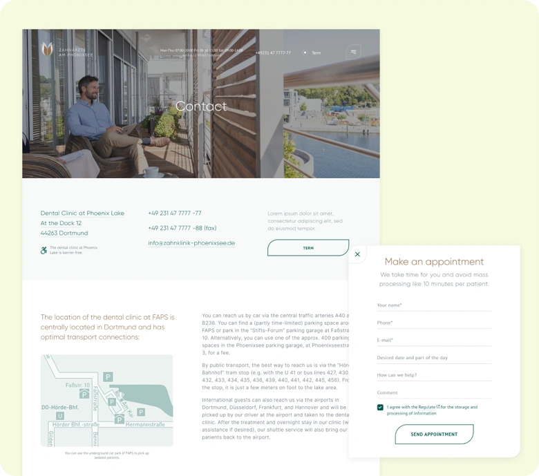 This page provides detailed directions on how to reach the clinic — by car, public transport, or from the airport. Special attention is given to accessibility: the clinic ensures a barrier-free environment for every patient.