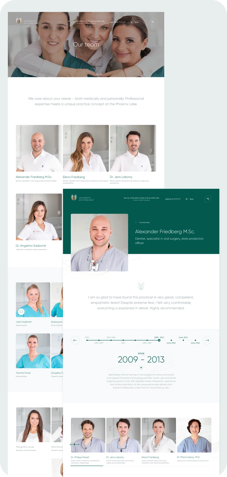 The team section introduces every staff member. People tend to trust those they feel familiar with — even if it’s just through a photograph. That’s why we included portraits, names, and job titles, helping to build trust and lower the barrier to the first visit.