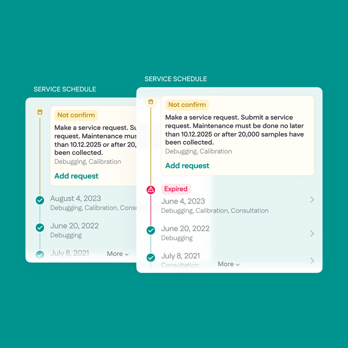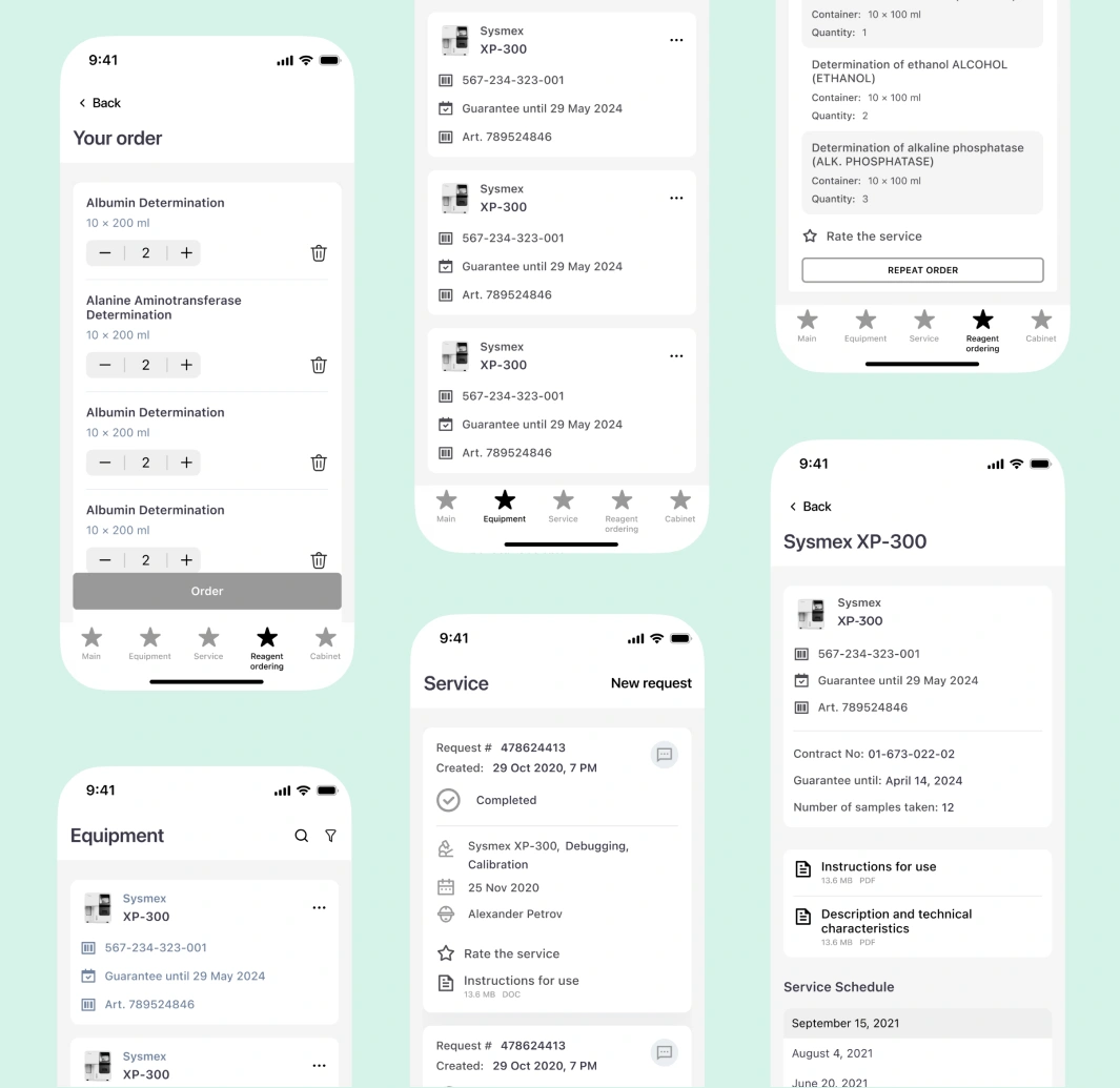 We designed intuitive navigation by combining Material Design and Human Interface Guidelines principles. Key sections (equipment, service, reagents) are accessible within 1-2 taps. Frequently used functions (creating requests, checking maintenance) were placed on the dashboard, while urgent actions (overdue service) were highlighted with color and icons. This solution provides instant access to 95% of functionality without deep menus, while maintaining a clean interface.