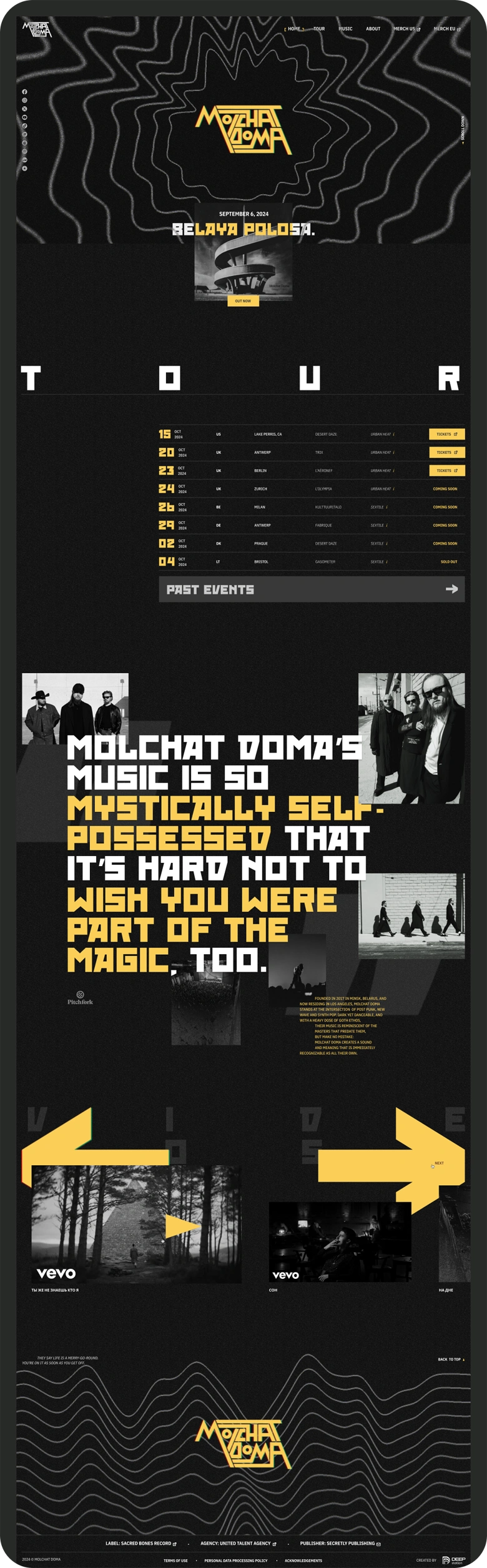 The page tells the story of the band and how it has grown, featuring quotes from well-known media about Molchat Doma. The design is based on expressive black-and-white photography, with bold yellow accents woven in.