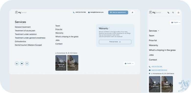 We focused on making navigation intuitive and user-friendly. In addition to standard links to services and sections, the dropdown menu highlights the clinic's guarantee and includes video instructions on how to reach the clinic.