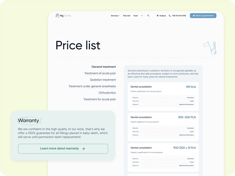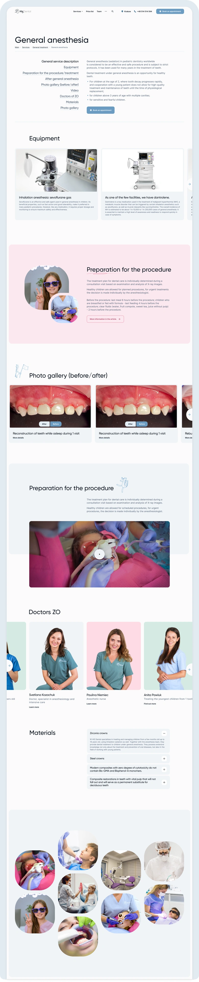 Each service has its own landing page, where parents can find detailed information on how to prepare for the procedure, what equipment and materials will be used, who will treat the child, and what results to expect.