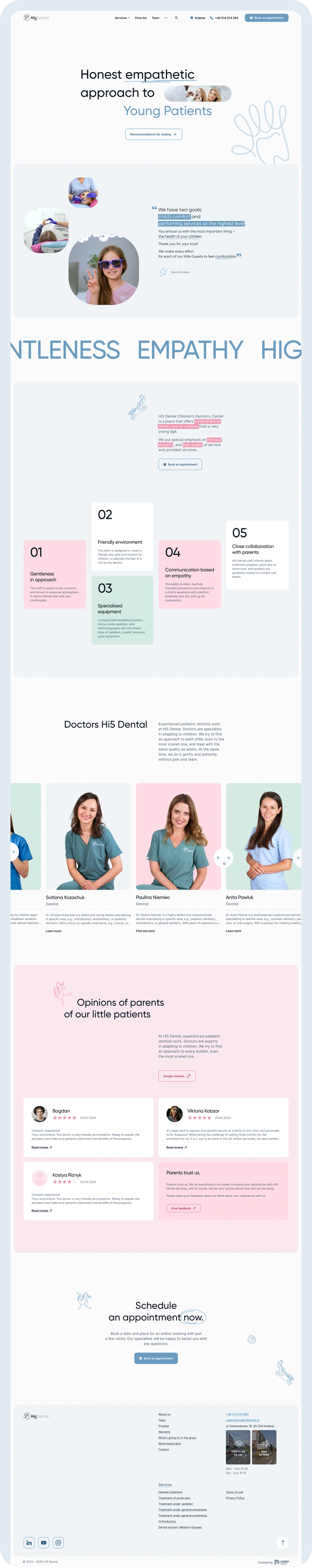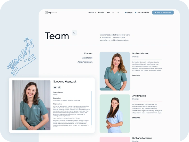 A separate section is dedicated to Hi5 Dental’s doctors. Each specialist’s education and experience are described in detail. We also include some personal insights and links to their social media profiles. This helps parents see the doctors not only as medical professionals but also as empathetic individuals.